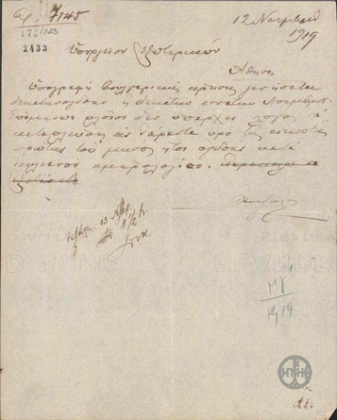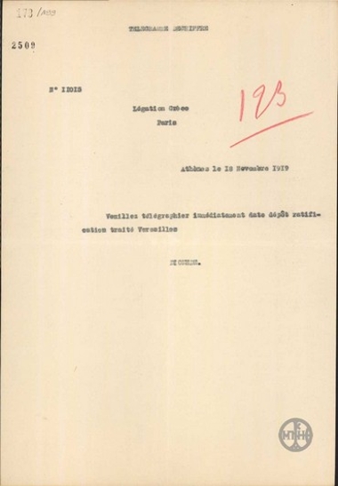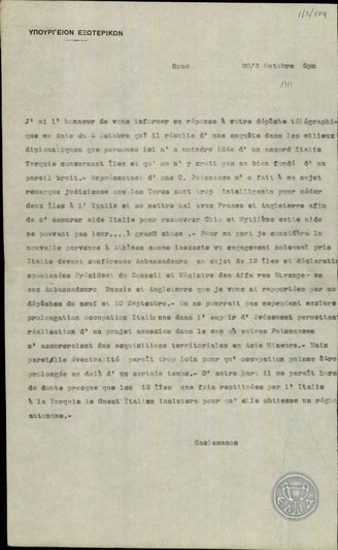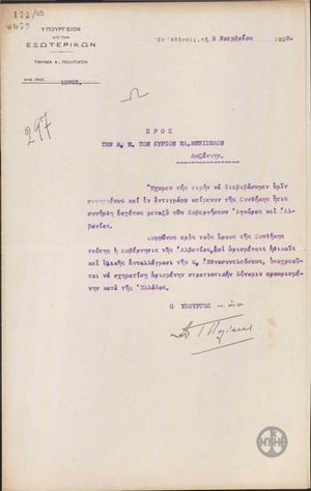 Letter from I. Politis to E. Venizelos forwarding a telagram from the Ministry of Foreign Affairs.