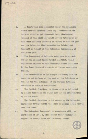 Telegram from I. Alexandropoulos to the Ministry of Foreign Affairs regarding an imminent accord between Bulgaria and Turkey.