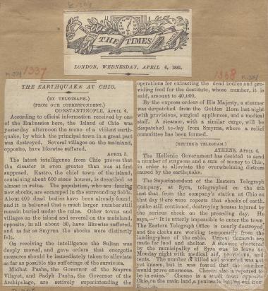 "The Εarthquake at Chio". Άρθρο της εφημερίδας "The Times". 06/04/1881