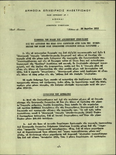 Υπόμνημα των μελών του Διοικητικού Συμβουλίου της Δημοσίας Επιχειρήσεως Ηλεκτρισμού επί της αιτήσεως της ΗΕΑΠ προς χορήγησιν αυτη παρά της κυβερνήσεως των μέσων όπως προμηθευθή πρόσθετον μονάδα παραγωγής.