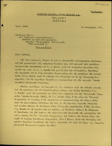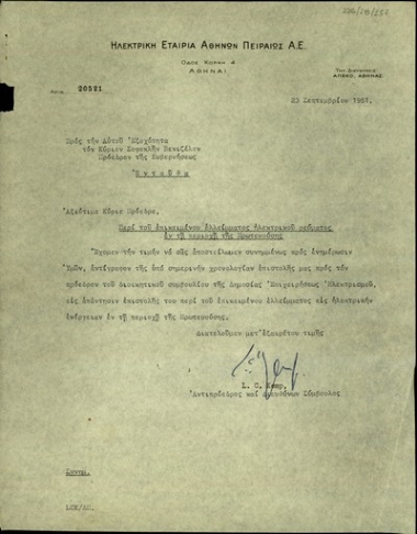 Αναφορά του Υπουργού Βιομηχανίας της Ελλάδας, Λ. Μακκά, προς την Ελληνική Ηλεκτρική Εταιρεία σχετικά με την ικανοποίηση αιτήσεων της εταιρείας.