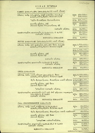Πίνακας με είδη διατροφής και στοιχεία για τη χρηματική τους αξία, το φόρο τους, το μικτό κέρδος κ.α.