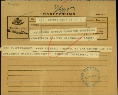 Τηλεγράφημα του Ε. Βενιζέλου προς τον Γ. Ναξάκη με το οποίο εκφράζει τη λύπη του για τη μη συνάντησή τους.