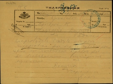 Τηλεγράφημα του Α.Ζαΐμη προς τον Ε.Βενιζέλο και την Ε.Βενιζέλου, με την οποία εκφράζει ευχές προς την Ε.Βενιζέλου.