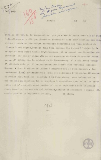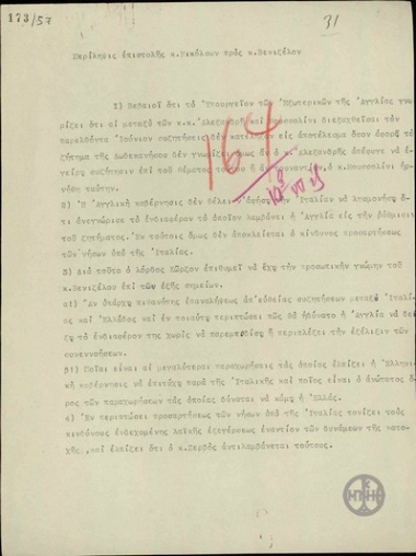 Τηλεγράφημα του Κ.Διαμαντόπουλου προς τον Ε.Βενιζέλο σχετικά με δήλωση του Ιταλού Πρωθυπουργού για τη Θεσσαλονίκη.