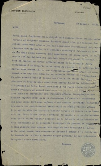 Τηλεγράφημα του Ά.Ρωμάνου προς το Υπουργείο Εξωτερικών σχετικά με τις σχέσεις της Βουλγαρίας με την Ελλάδα και την Τουρκία.