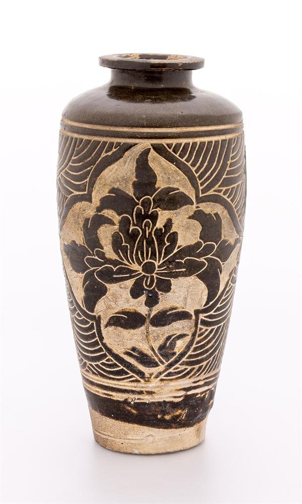 Jar of toffee colour-glazed porcelain and white slip painted decoration