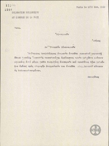 Telegram from the Director of the Office of the Prime Minister, N. Roussos, to the Governor of Macedonia, concerning the dispatch of money for food.