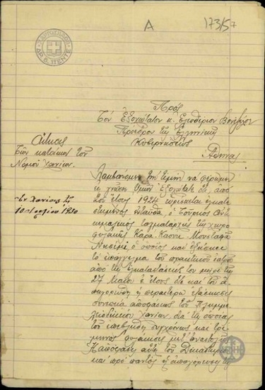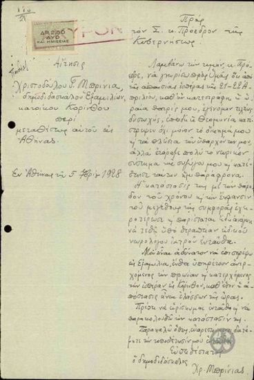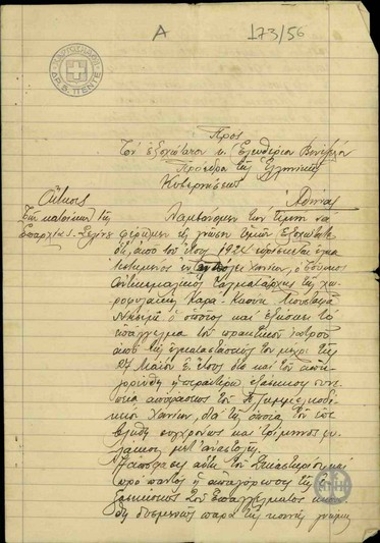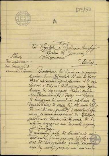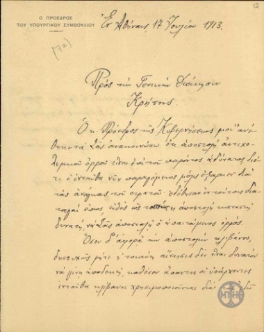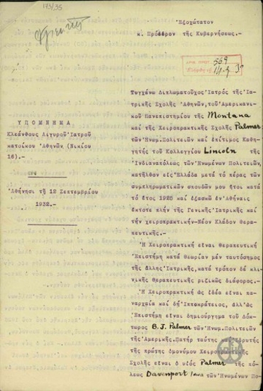 Αίτηση των κατοίκων της επαρχίας Αποκορώνου Σφακίων προς τον Ε. Βενιζέλο σχετικά με το ζήτημα της χορήγησης άδειας εξάσκησης του επαγγέλματος του πρακτικού ιατρού στον Καρα καούκ Μουσταφά Νεσιμί.