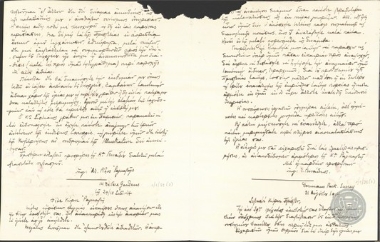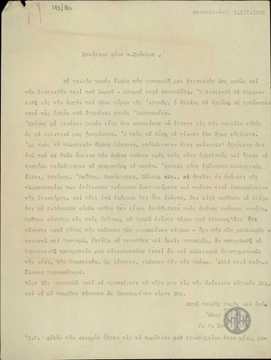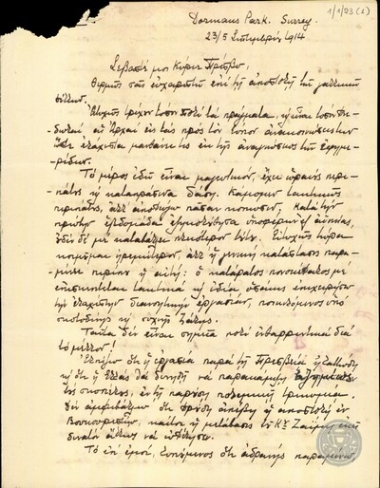 Επιστολή του Ε. Βενιζέλου προς τον Μ. Βενετάκη με την οποία του εκφράζει ευχές για την αποκατάσταση της υγείας του.