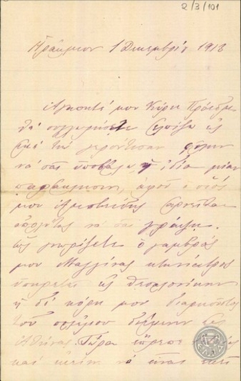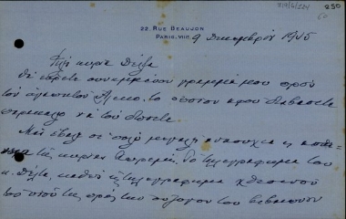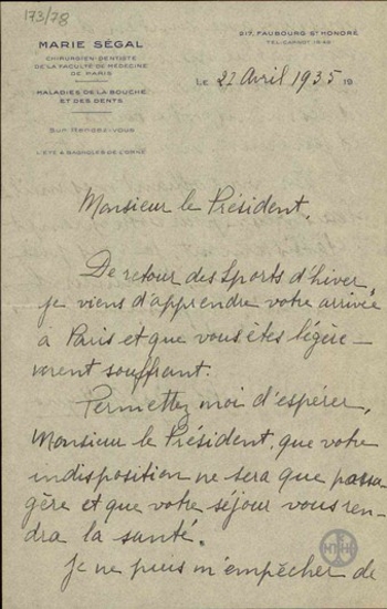 Επιστολή της M. Segal Gattegno προς τον Ε. Βενιζέλο με την οποία εκφράζει την ανησυχία της για την υγεία του και του εύχεται γρήγορα περαστικά.