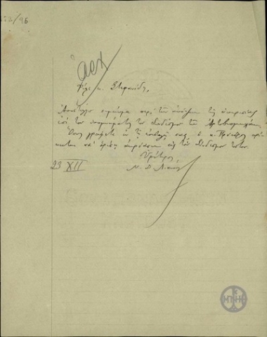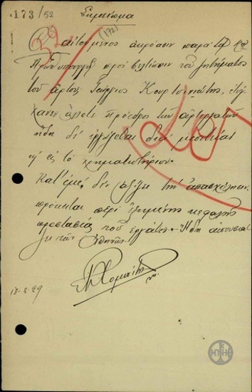 Σημείωμα του Χομπίτη σχετικά με τη συνάντηση του Ε. Βενιζέλου με τον Γ. Κουρτσινιώτη.