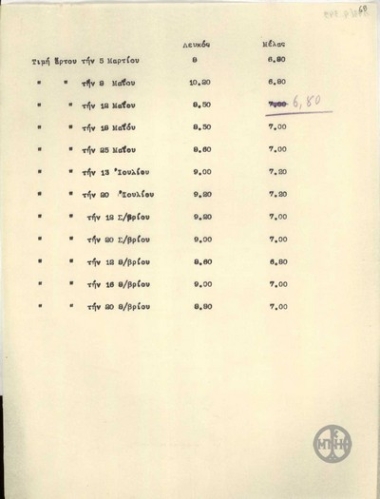 Κατάλογος με τις τιμές του άρτου από 5 Μαρτίου 1933.