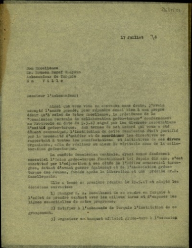 Επιστολή του Προεδρείου της Εθνικής Αμύνης Κωνσταντινούπολης προς τον Ε.Βενιζέλο σχετικά με την ανάληψη εκ μέρους του της εκπροσώπησης της Ελλάδας στο εξωτερικό.