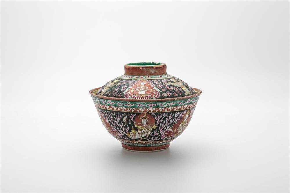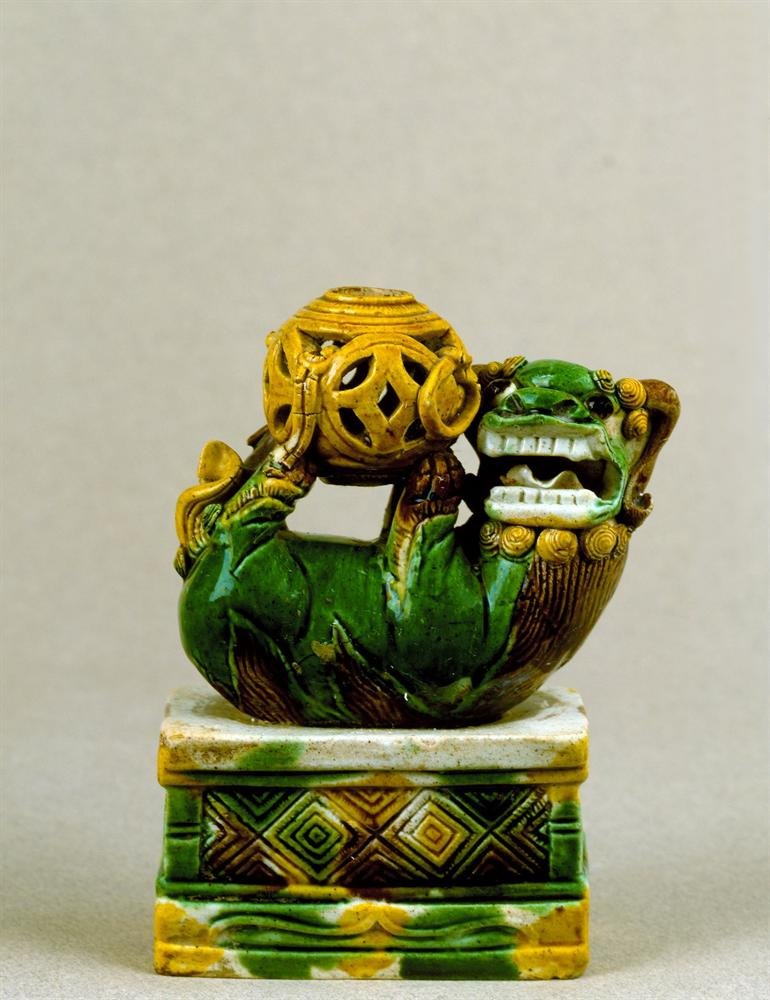 Buddhist lion figure, porcelain with moulded decoration and enamels