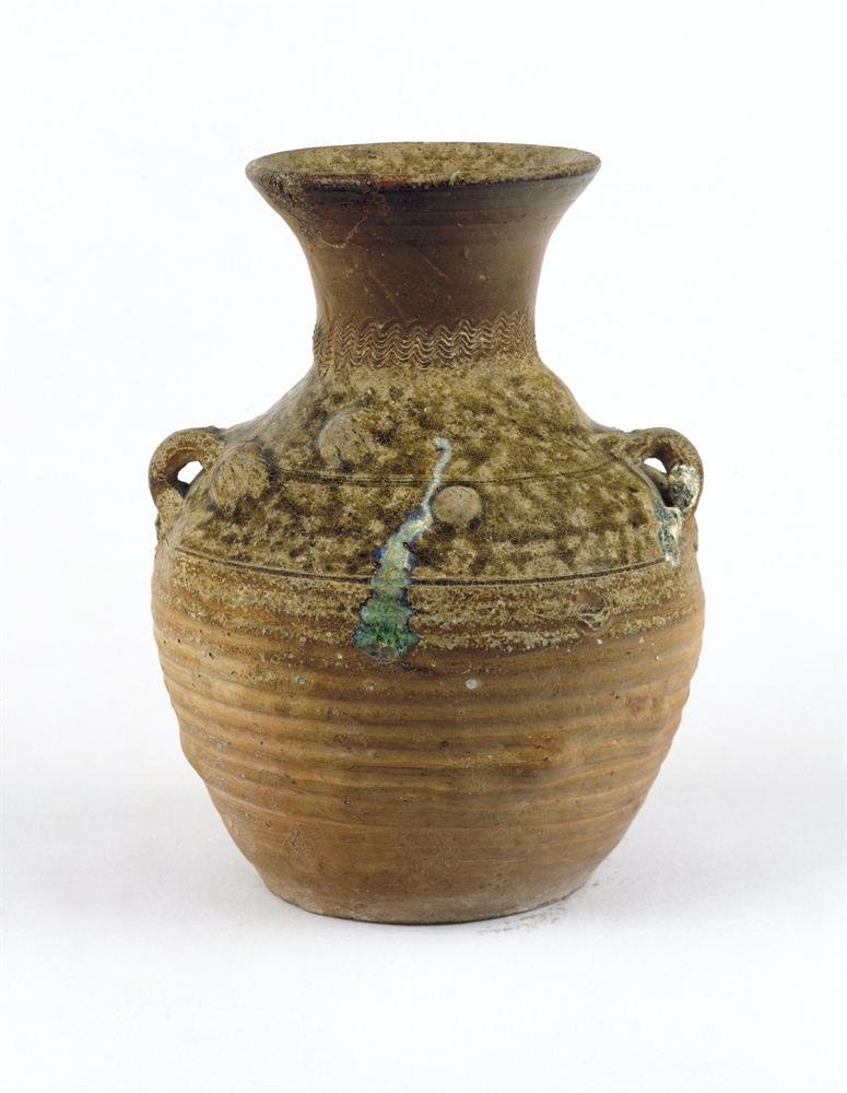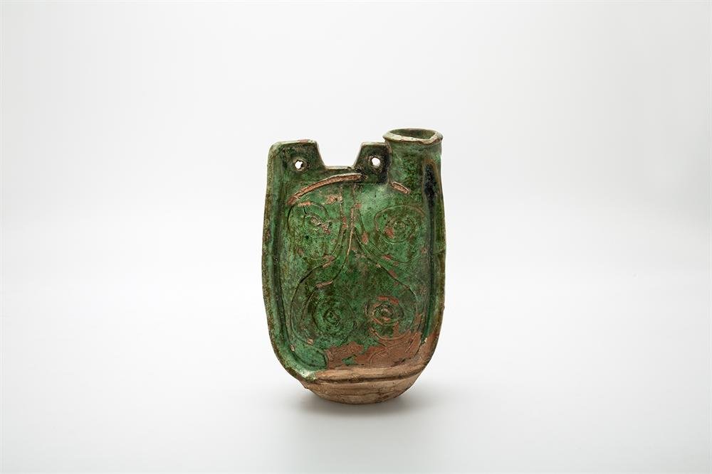 Αγγείο σε σχήμα φλασκιού, πηλός με πράσινη εφυάλωση και εγχάρακτη διακόσμηση
