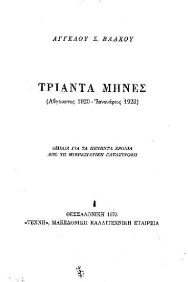 Τριάντα μήνες (Αυγουστος 1920- Ιανουάριος 1923): Ομιλία για τα πενήντα χρόνια από τη Μικρασιατική Καταστροφή