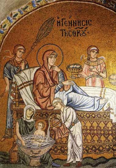 Η παράσταση της Γέννησης της Θεοτόκου από το καθολικό της μονής Δαφνίου.