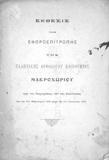 Έκθεσις της εφοροεπιτροπής της Ελληνικής Ορθοδόξου Κοινότητος Μακροχωρίου περί της διαχειρίσεως των της κοινότητος από της 18ης Φεβρουαρίου 1906 μέχρι της 31ης Αυγούστου 1907