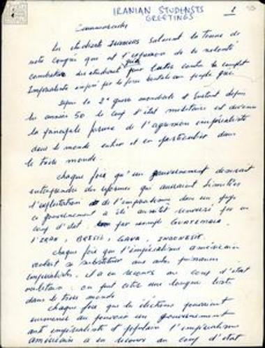 Text by Iranian students extending greetings to the Greeks and an invitation by the Union of Greek Students in Paris (EPES) to a demonstration at the Greek embassy in Paris