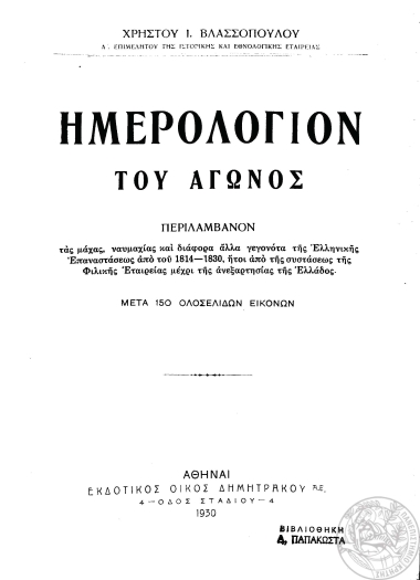 Ημερολόγιον του Αγώνος / Χρήστου Ι. Βλασσόπουλου.