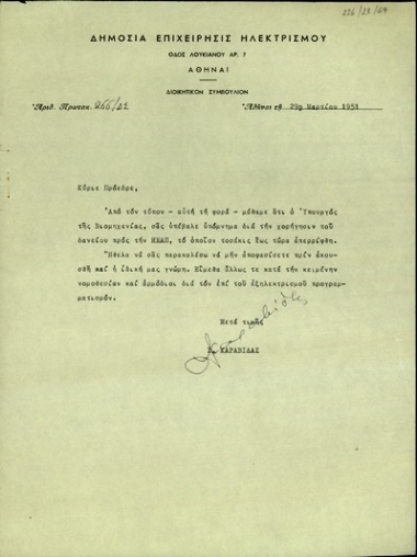 Επιστολή του Ι. Καραβίδα προς τον Σ. Βενιζέλο σχετικά με το διορισμό των μελών του Διοικητικού Συμβουλίου της Δημόσιας Επιχείρησης Ηλεκτρισμού.