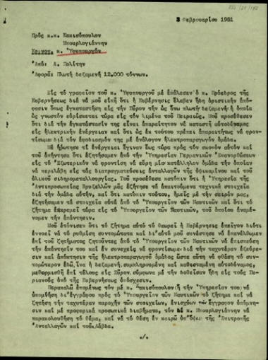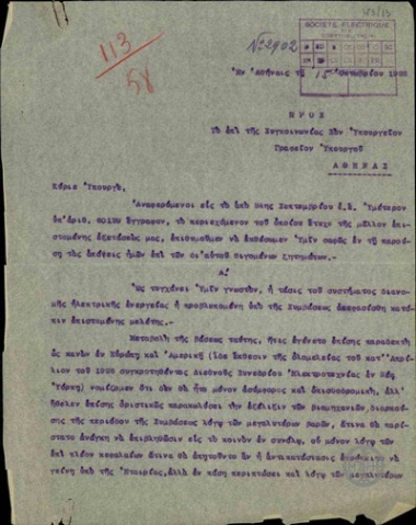 Αναφορά του Υπουργού Βιομηχανίας της Ελλάδας, Λ. Μακκά, προς την Ελληνική Ηλεκτρική Εταιρεία σχετικά με την ικανοποίηση αιτήσεων της εταιρείας.