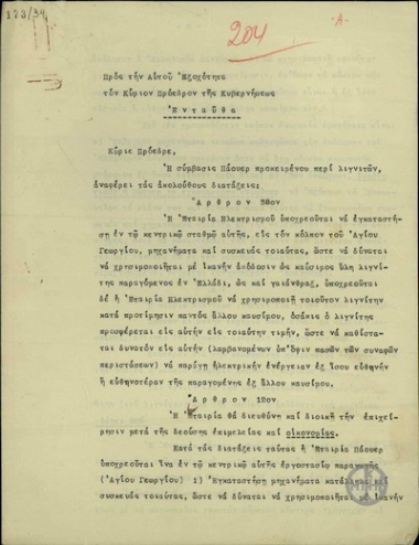 Επιστολή του Αντιπροέδρου της Ηλεκτρικής Εταιρείας Αθηνών-Πειραιώς Α.Ε., L. C. Kemp, προς τον Πρόεδρο της Ελληνικής Κυβένρησης, Σ. Βενιζέλο, σχετικά με το επικείμενο έλλειμα ηλεκτρικού ρεύματος στην Αθήνα.