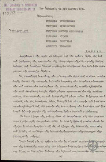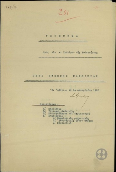 Υπόμνημα προς τον Ε. Βενιζέλο περί ευθηνής κατοικίας.