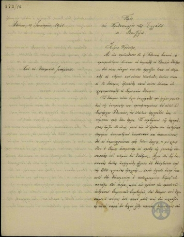 Επιστολή του Γ. Ναξάκη προς τον Ελευθέριο Βενιζέλο σχετικά με ζητήματα που αφορούν στην οικία του τελευταίου στη Χαλέπα Χανίων.