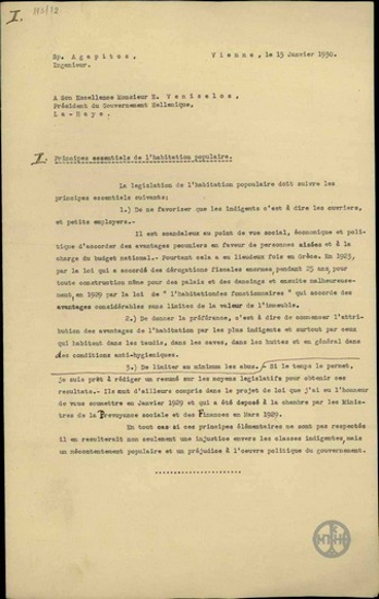 Υπόμνημα του μηχανικού Σπ. Αγαπητού προς τον Ε. Βενιζέλο σχετικά με το νομοθετικό πλαίσιο που θα πρέπει να διέπει τη λαϊκή κατοικία ώστε να εξυπηρετηθούν αυτοί πραγματικά που έχουν ανάγκη.