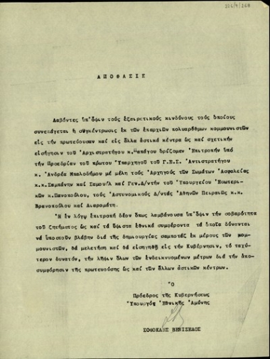 Απόφαση του πρωθυπουργού και υπουργού Στρατιωτικών Σ. Βενιζέλου σχετικά με τη συγκρότηση επιτροπής για τη μελέτη και την εισήγηση μέτρων για την αποσυμφόρηση της πρωτεύουσας και των άλλων αστικών κέντρων από τους πολυάριθμους κομμουνιστές.