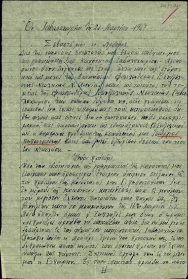 Επιστολή του Ναυλαρχου Ι. Χαλκιόπουλου προς τη Διεύθυνση Ασφαλείας του Υπουργείου Εσωτερικών της Ελλάδας με την οποία διαβιβάζει αίτηση των συμμοριοπλήκτων εκ Κάρδης οι οποίοι διαμαρτύρονται για τον χαρακτηρισμό τους ως κομμουνιστές.