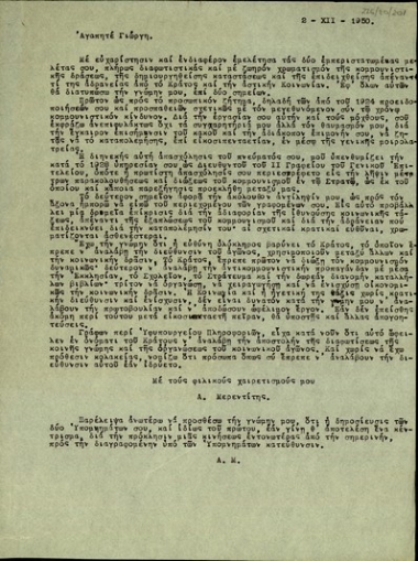 Επιστολή του στρατάρχη Αλεξ. Παπάγου προς τον Πρόεδρο της Ελληνικής Κυβέρνησης, Σ. Βενιζέλο, σχετικά με την πρότασή του για σύσκεψη για την αντιμετώπιση της νέας μορφής του κομμουνισμού.