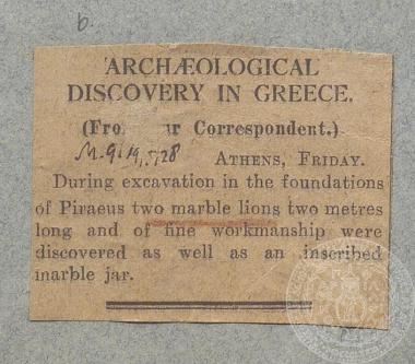 "Archaeological discovery in Greece", άρθρο εφημερίδας 19/05/1928