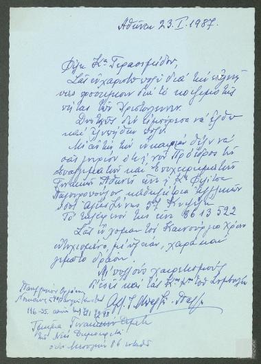 Ευχαριστήρια επιστολή Αλεξάνδρας Μπαγτζή - Πάλλη προς την Γερασιμίδου. Αναφορά στη νέα Πρόεδρο του Συνδέσμου των Επαγγελματιών και Επιχειρηματιών Γυναικών Αθηνών, Παγουροπούλου