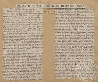 "Βουλγαρικαί Εξομολογήσεις". Άρθρο της εφημερίδας "Κλειώ", 22/06/1868 | 04/07/1868