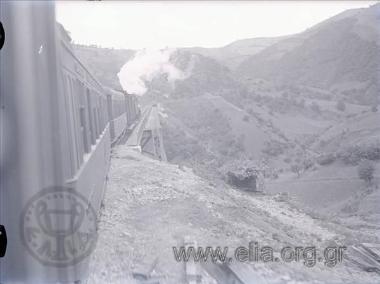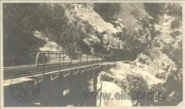 Πλοίο διασχίζει τον Ισθμό της Κορίνθου. Τρένο στη σιδηροδρομική γέφυρα.
