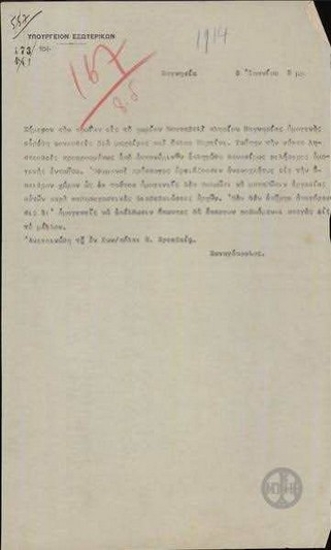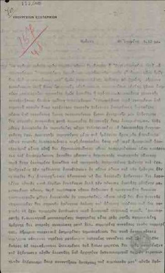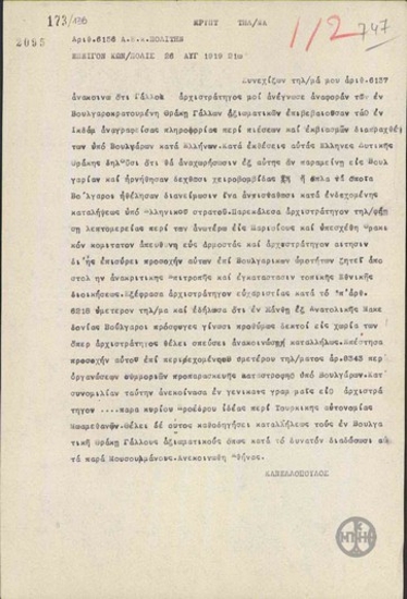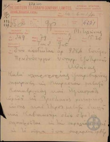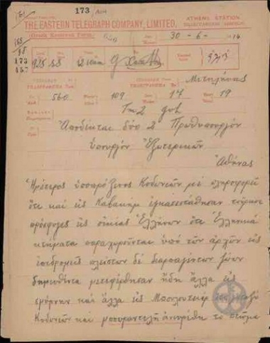 Telegram from K. Dimaras to the Ministry of Foreign Affairs regarding the incidents against Greeks in Eglezonisi.