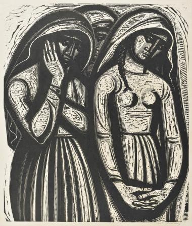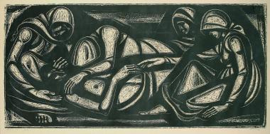 Tassos was a militant artist and his work is defined by technical skill in combination with an emotional expression of ordinary people through their toil and pain. He was affected by the byzantine art, while gradually giving up on colour and working on the contrast between black and white. He started carving bigger wooden panels and creating monumental themes.