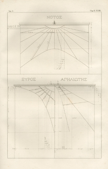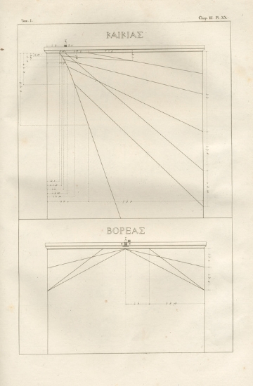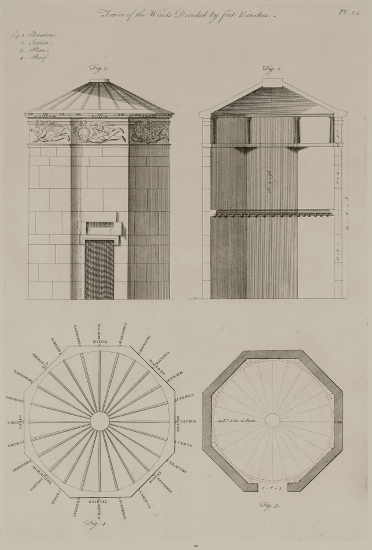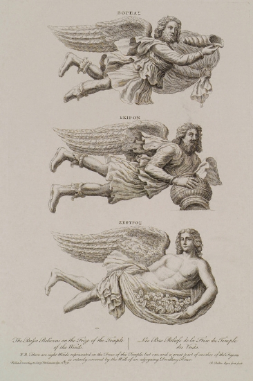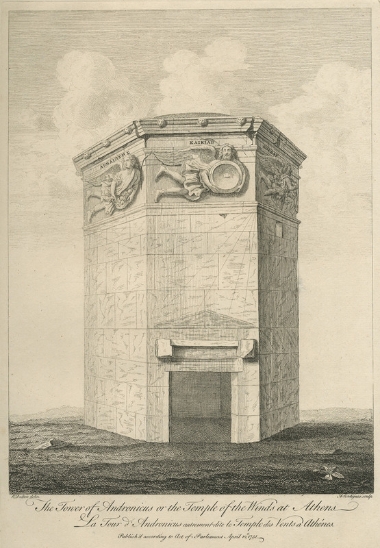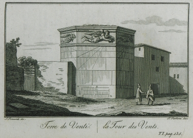 It is an octagonal tower made of pentelic marble with a conical tiled roof and two corinthian entrances on the north and west sides. The name Aerides is due to the relief depiction of the eight winds in an equal number of metopes of the building. At the top of the roof was a brass weather vane in the form of Triton, which, moving by the wind, indicated the direction of one of the eight winds. The marble personified winds fly at the top of each side of the building, bearing a special symbol and their name inscribed above them. Around the building there were sundials, while inside there was a hydraulic clock.